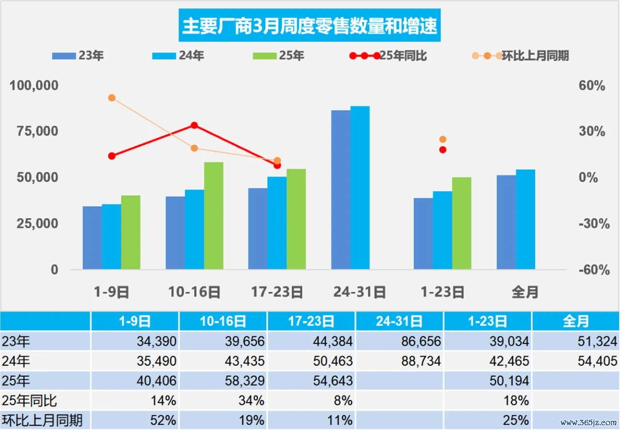 3月1-23日,全国乘用车市场零售115.4万辆,同比去年3月同期增长18%,较上月同期增长25%;今年以来累计零售433万辆,同比增长5%。